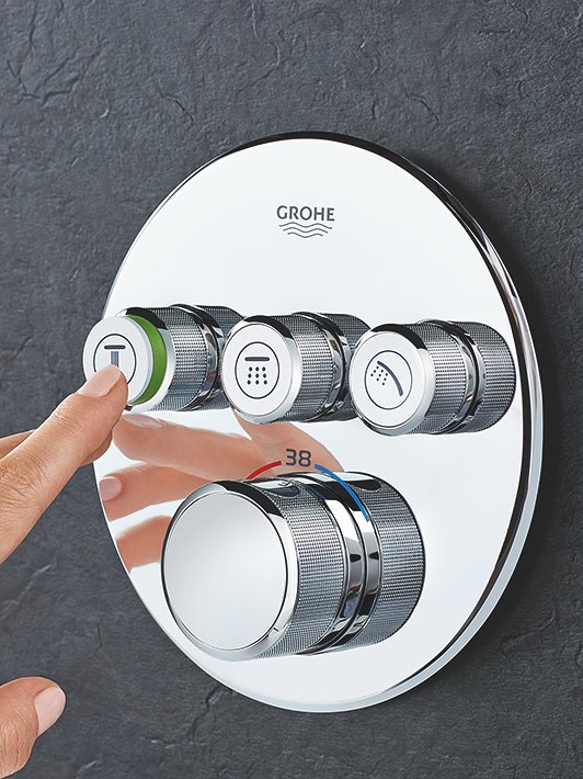 The design of Grohtherm SmartControl goes far beyond just functional Its slim and streamlined look fits beautifully in every bathroom. The 10 mm thin wall plates make the Grohtherm SmartControl trim sets both elegant and space-saving.